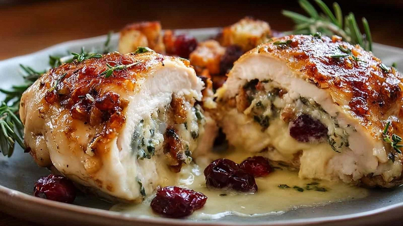 Once assembled, let the chicken rest for a minute before cutting; this allows the brie to set slightly, making the slices cleaner. The final garnish can be a sprinkle of fresh rosemary or a few whole cranberries for an extra pop of color.
